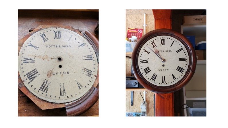 Peter talked about restoring a wall clock that had been so badly water damaged that many would have binned the remains. The clock had lost most of its octagonal wooden moulding around the dial. An artist acquaintance had been able to reconstruct this using ‘DAS’ modelling clay and remarkable wood like staining to recreate the missing pieces. He also talked about his use of the new type of UV curing glues to repair the rating nut thread that had sheared off.
