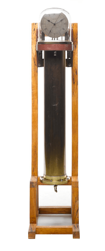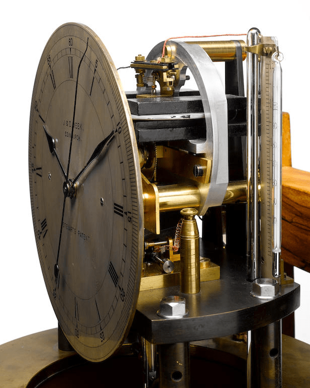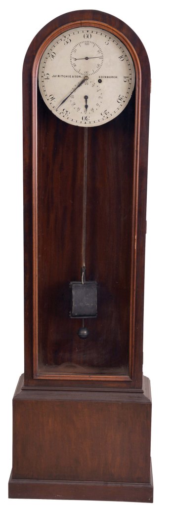 This clock was the only one ever made with a vacuum tank. It was manufactured by John Meek (1857-1934) of J & D Meek, The Mound, Edinburgh. It was displayed in his shop window for several decades. It was claimed to have an accuracy of better than a second per year. Steuart Clocks were also made by Ritchie’s of Edinburgh and Thomas Mercer’s of St Albans.