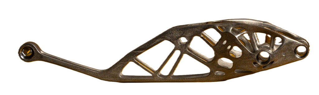 Nowadays, a computer revolution later, it is possible to design parts and simulate performance prior to any part being made. This goes in equal measure from suspension components to whole car bodies. Andrew used, as an example, a design study of a suspension lower control arm. Originally machined from a billet of steel. It could be made lighter using aluminium, lighter still with titanium. Each had different properties other than just weight. How much they bent under load and how much load to critical failure. These are obviously important for safety. However, the question remains of just how light can you go? i.e. just how little material and still have a useful and safe component. They solved this with a development program called ATOMS. Advanced Topology Optimised Metalic Structures. This exercise resulted in a structure with optimised weight for the expected loading. It looked nothing like the previous designs. It is much more something that you would expect nature to have developed over a few millennia of evolution. See Figure 1.